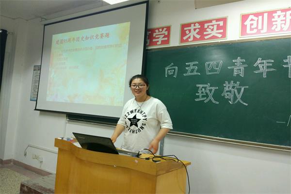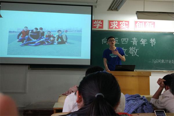 活动分为“团史学习”、“激昂青春传递正能量”两部分。会上, 15应用统计团支部书记吴萌同学向大家宣讲了团史、团章和五四知识等内容,并以多媒体展示的形式进行讲解分析,在场的学生们认真聆听,大家并就日常团学干部工作方面的问题进行热烈地交流讨论。在活跃、欢快且充满正能量的活动中,各位同学积极踊跃发言,结合大学校园生活,畅谈青年学生理想担当与国家民族的前途命运。