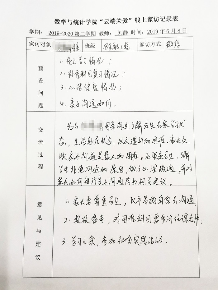 为了切实加强疫情防控,做好学生思想教育管理和重点关爱引导,beat365针对学院重点关注学生群体,开展“云端关爱”线上家访活动。党总支副书记陈攀峰和辅导员刘静、王琦、钟文峰、赵丽莎利用微信、腾讯会议、QQ视频、钉钉等移动端方式与家长、学生进行线上联系,隔空传递拳拳师爱。