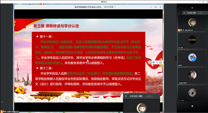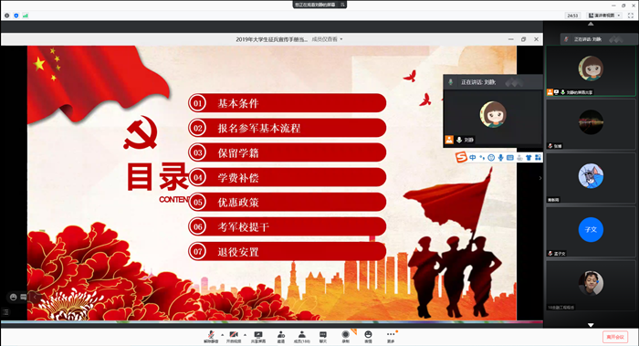 为加强2021年春季征兵宣传工作,1月4日晚8时,beat365举行2021年春季征兵宣讲会。因考虑毕业班同学在校外实习,本次宣讲会采用线上宣讲的形式。团总支书记刘静担任本次宣讲的主讲人,学院各年级学生参加了此次会议。