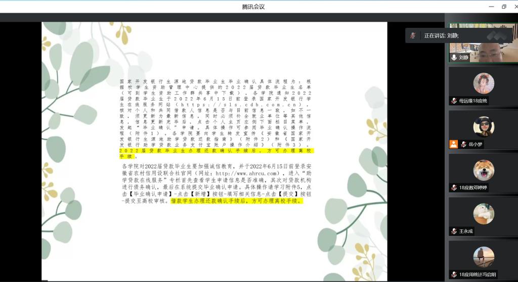 宣讲通过腾讯会议的形式进行,辅导员宣讲了大学生助学贷款、国家励志奖学金、国家助学金、勤工助学学费减免、校内助学金、临时困难补助、退伍大学生学费减免、求职补助等不同资助政策的申请流程、评审程序、资助发放操作办法等;针对学生可能存在资助政策理解偏差与困惑的地方,进行了专门的阐释和引导,鼓励符合条件的学生积极申请相关资助项目,减轻经济负担。宣讲会最后,辅导员细心耐心地解答了同学们在一些资助问题上的疑问和困惑。