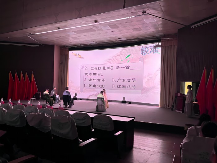 竞赛在一段精彩的武术表演后拉开了序幕。大赛的第一轮:轻取选择题。主办方准备50道题目,其中涉及五类:民俗文化、饮食文化、服饰文化、民俗工艺品、建筑文化。参赛同学依据现场抽签结果分别分为A,B两组依次上场作答。第二轮进入了飞花令的比拼。选手们着一袭汉服,倾万重诗情。厚积薄发,应答自如。第三轮的比拼是激烈抢答题,双方选手不分上下,他们的精彩表现博得了台下观众的阵阵掌声。经过两个多小时的激烈比拼,最终数统学院荣获一等奖,管理学院和音乐学院夺得二等奖,外国语学院,文学与传媒学院和机械与电子学院荣获三等奖!