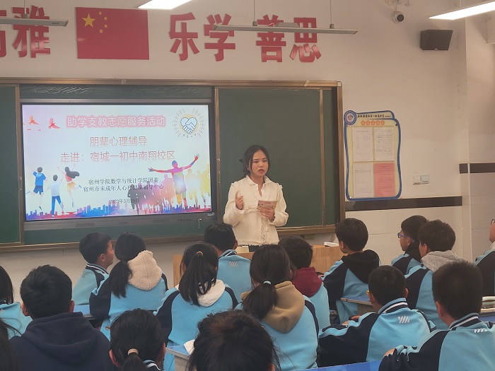 为落实发展朋辈心理辅导队伍建设,夯实心理健康教育网格体系,有效推进宿州市中小学心理健康教育工作的开展,我院beat365团委携手宿州市未成年人心理健康辅导中心于2023年3月29日下午走进宿城一初中南翔校区开展朋辈心理健康知识宣讲活动。本次宣讲由beat365朋辈心理宣讲团承办,活动得到了我院师生心理健康辅导中心的大力支持。