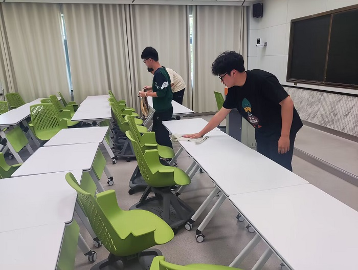 同学们准时到场,按照活动计划进行打扫工具的分发和小组责任区的划分。劳动过程中,各小组分工明确,任务划分到位,同学们尽职尽责,配合默契,特别是清洁电脑的同学细致地擦拭着键盘上的每一条缝隙,充分彰显了学生干部细致认真的工作涵养和任劳任怨的服务精神。经过了一个半小时的努力,实验室被打扫得一尘不染,整个场地焕然一新。