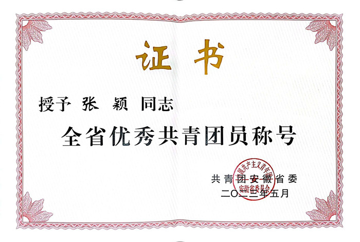 “安徽省优秀共青团员”是共青团安徽省委授予省内团员的最高荣誉。张颖同学用实际行动为我院广大团员青年树立了榜样,彰显了学院党委在坚持立德树人根本任务、贯彻“三全育人”理念上取得的良好工作成效。