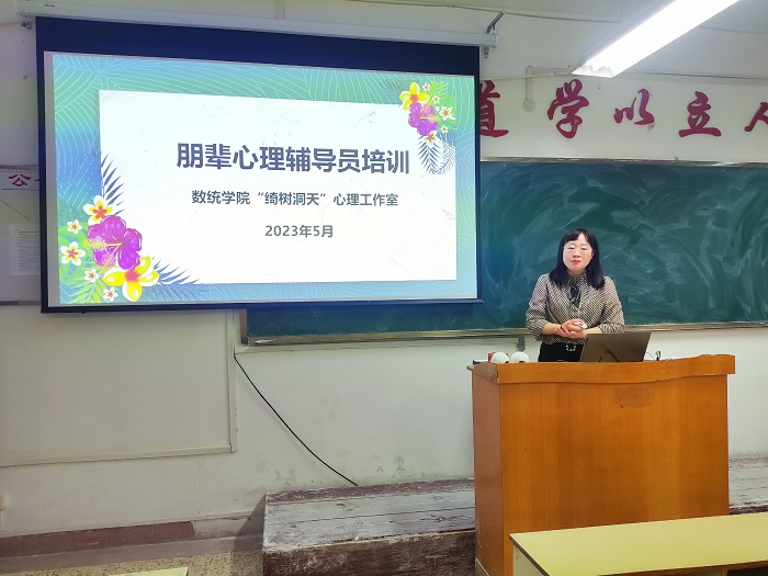 为提升朋辈心理辅导员辅导技能,beat365“绮数洞天”心理工作室于2023年5月26日下午3:00在教学楼A103组织朋辈心理辅导员培训讲座。本次讲座的主题是“大学生心理问题的识别与预防”,主讲人是数统计学院心理辅导员刘静,培训对象为数统院21、22级各班心理委员和宿舍心理信息员。