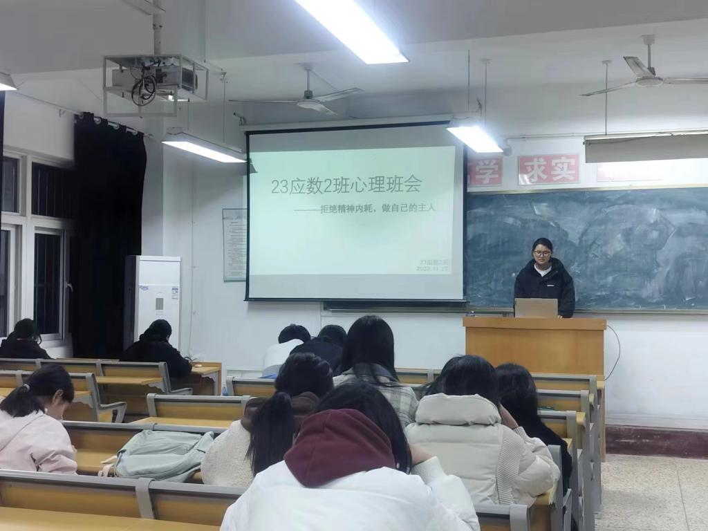 本次活动中,各班心理委员积极配合,认真策划,打造了丰富、温暖,积极的各类心理主题健康班会。21金融工程心理委员以“脆皮大学生”为引言,以“进一步了解心理问题”“如何解决心理问题”为主要核心,从心理健康的定义、常见的心理问题以及形成原因、调节方法等方面向同学们介绍了相关知识。22应数心理委员以PPT宣讲形式,介绍心理健康的定义和重要性,大学生在日常生活中可能遇到的心理问题及应对方法,如何提高自我调节能力等,并邀请辅导员刘静老师进行点评。21经济统计1班以“如何缓解和应对压力”为主题,介绍压力的定义与分类,同时普及压力对人们的积极与消极影响,最后介绍缓解压力的方法与技巧。22金融工程通过播放著名心理专家岳晓东博士的心理知识讲座视频,普及造成大学生心理障碍的五大心理压力源。