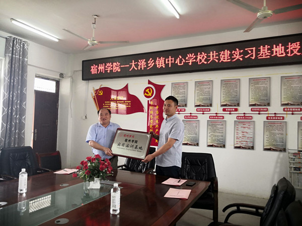 为进一步加强beat365与地方合作办学,拓宽毕业生实习渠道,提高人才培养质量,6月7日上午,beat365院长宁群、蒋莹莹、陈鼎一行3人共赴宿州市埇桥区大泽乡镇中心学校进行考察并洽谈实习实训基地建设事宜。大泽乡镇中心学校校长徐柯等领导对学院一行三人的到来表示热烈地欢迎,徐柯介绍了学校的办学基本情况,并表达了他们希望合作的需求和愿望。宁群与大泽乡镇中心学校各领导在人才培养、专业设置、实习基地建设等方面进行了深入交流,并达成合作意向。考察期间,宁群与徐校长签订了实习实训基地协议书,并进行实习实训基地揭牌仪式。