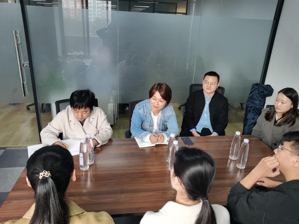 陈攀峰一行首先来到安徽省安策智库咨询有限公司,受到公司实地调研部负责人姚伟和陈锋的热情接待,并见到了在公司工作的四位毕业生,他们分别在这里工作了一到两年的时间不等。接待会上,姚伟介绍了这些毕业生的工作内容,赞扬他们日常工作勤奋踏实。毕业生们也分享了自己的工作感想,原16级经济统计班的高延同学认为,在学校里学的很多专业知识都能派的上用场,特别是一些软件操作类的技能。也有同学表示工作中需要有人际交往的能力,因此大学期间多参加学校组织的活动很重要。