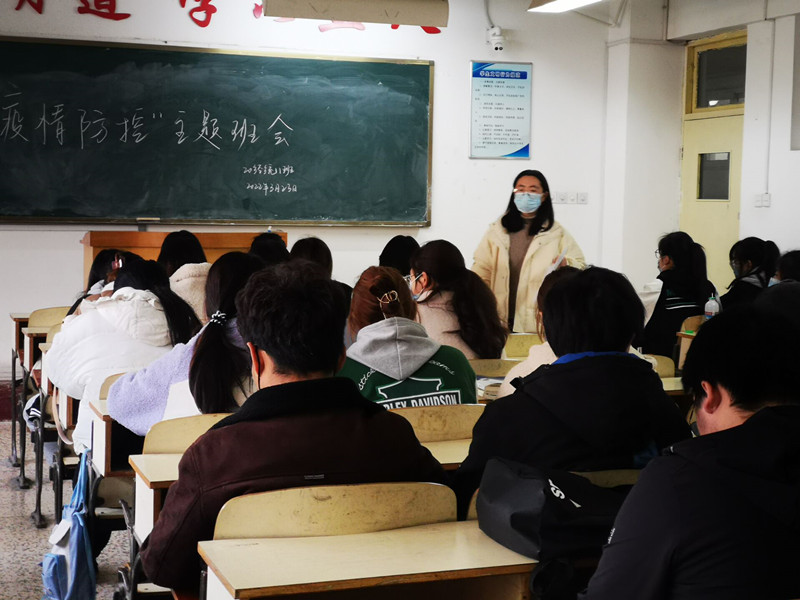 主题班会上,辅导员首先带领班级学生学习了学校《关于从严抓好当前学校疫情防控工作的通知》,接着强调了以下几点内容:一是凡是出现身体出现发热、腹泻、咽痛等疑似症状的,要第一时间上报。二是要求以寝室为单位,做好每天的晨午晚检工作,做好日报告和零报告,落实疫情防控网格化、责任制的工作要求。三是在校生要严格履行请销假制度,非必要不离校,禁止点外卖及翻越围墙。四是坚持全员佩戴口罩,勤洗手,勤通风,多锻炼,做好个人防护。会后辅导员对防疫物资的发放管理也进一步做了部署说明。