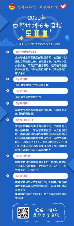 4月10日至5月31日,2020年普通高等学校应届毕业生或在读研究生可通过微信公众号“西部志愿汇”(菜单栏中的“我要报名”)或登录西部计划官网(http://xibu.youth.cn),在西部计划报名系统中进行注册报名。
